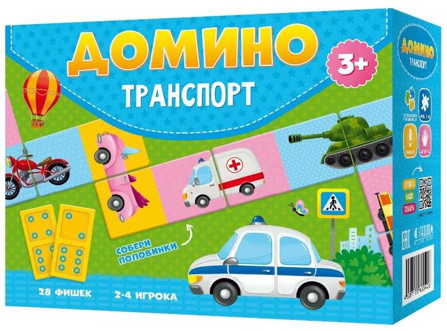 В наборе — 28 двусторонних фишек из картона с изображениями транспорта. На каждой карточке — две половинки двух разных видов машин. Кости подходят для сражений в стиле классических доминошек детям от 3 лет. Также предусмотрен второй вариант игрушки, в ходе которого выстраивается цепь фишек. Они соприкасаются половинками с одинаковым количеством гаечек, обозначающих число очков.