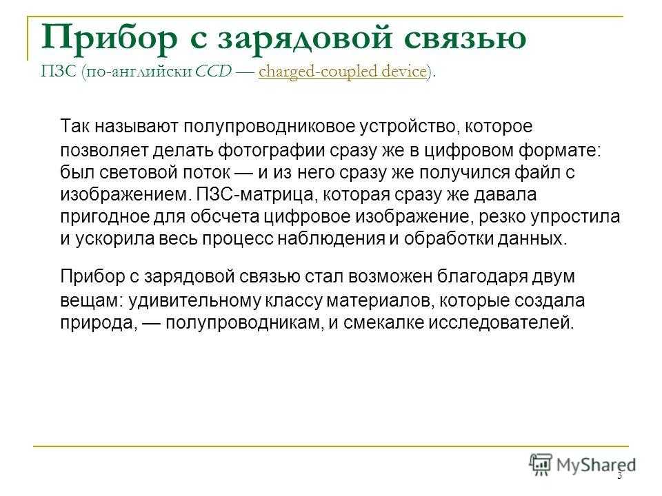 3 Прибор с зарядовой связью ПЗС (по-английски CCD charged-coupled device).charged-coupled device Так называют полупроводниковое устройство, которое позволяет делать фотографии сразу же в цифровом формате: был световой поток и из него сразу же получился файл с изображением. ПЗС-матрица, которая сразу же давала пригодное для обсчета цифровое изображение, резко упростила и ускорила весь процесс наблюдения и обработки данных. Прибор с зарядовой связью стал возможен благодаря двум вещам: удивительному классу материалов, которые создала природа, полупроводникам, и смекалке исследователей.