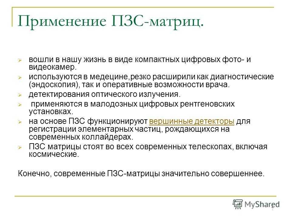 7 Применение ПЗС-матриц. вошли в нашу жизнь в виде компактных цифровых фото- и видеокамер. используются в медецине,резко расширили как диагностические (эндоскопия), так и оперативные возможности врача. детектирования оптического излучения. применяются в малодозных цифровых рентгеновских установках. на основе ПЗС функционируют вершинные детекторы для регистрации элементарных частиц, рождающихся на современных коллайдерах.вершинные детекторы ПЗС матрицы стоят во всех современных телескопах, включая космические. Конечно, современные ПЗС-матрицы значительно совершеннее.