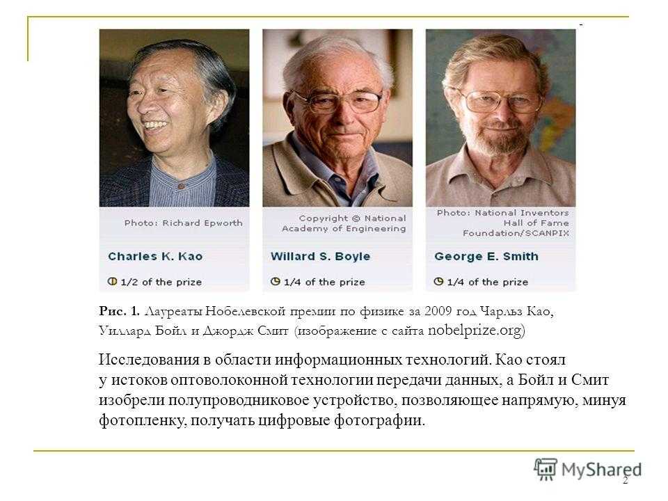 2 Рис. 1. Лауреаты Нобелевской премии по физике за 2009 год Чарльз Као, Уиллард Бойл и Джордж Смит (изображение с сайта nobelprize.org) Исследования в области информационных технологий. Као стоял у истоков оптоволоконной технологии передачи данных, а Бойл и Смит изобрели полупроводниковое устройство, позволяющее напрямую, минуя фотопленку, получать цифровые фотографии.