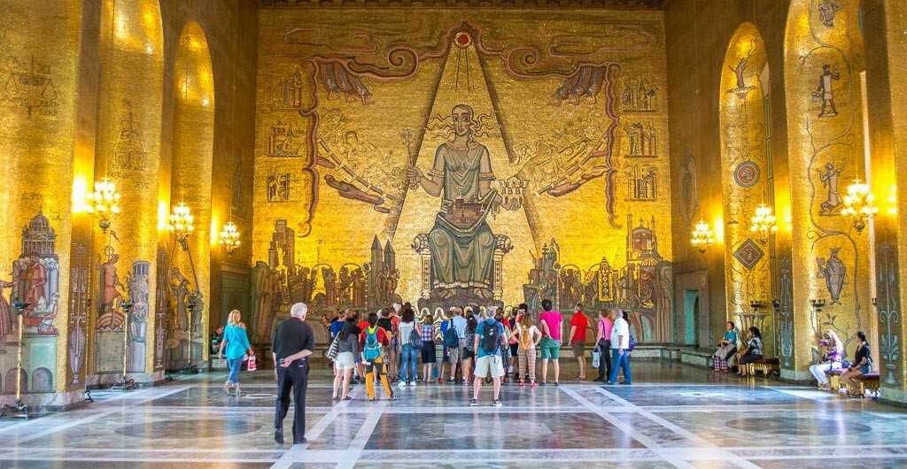 Интерьеры здания поражают своей роскошью. Залы украшают хрустальные люстры, на стенах можно увидеть дорогие гобелены. Золотой зал отделан мозайкой из 18 позолоченных плиток, которые изображают эпизоды из истории Швеции. Отдельного внимания заслуживает Башня Стокгольмской ратуши, высота которой составляет 106 метров. При Башне располагается музей, где можно увидеть модели статуй и бюстов.