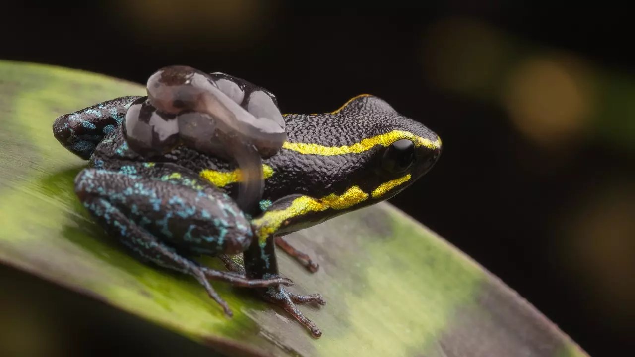 Небесно-голубая ядовитая лягушка (Hyloxalus azureiventris) с головастиками на спине. (Изображение предоставлено: Getty Images)