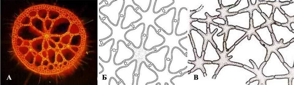 Рисунок: Аэренхима. А – аэренхима на поперечном срезе стебля; Б – клетки пленчатой перегородки, разделяющей полости аэренхимы; В – аэренхима из трехмерно расположенных звездчатых клеток.