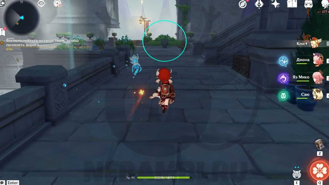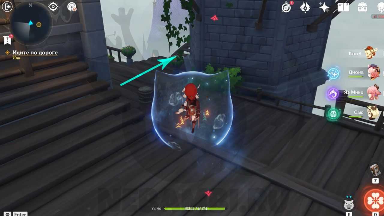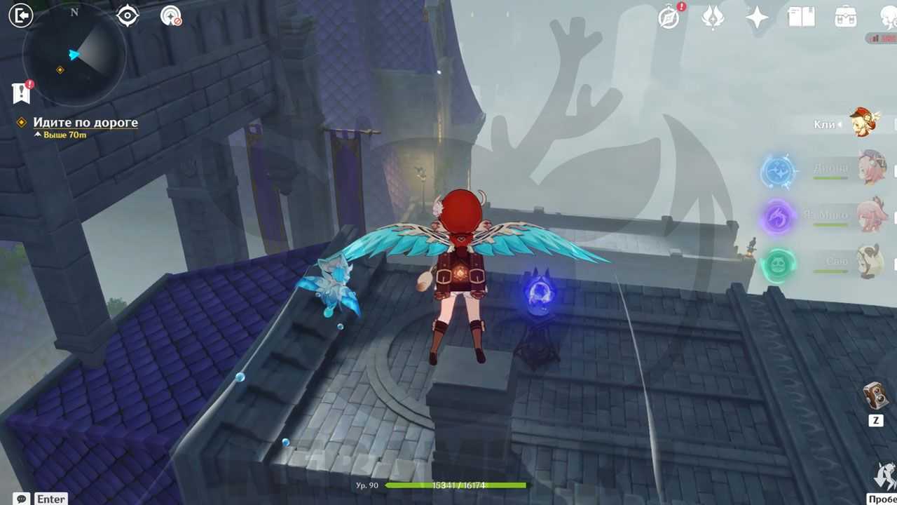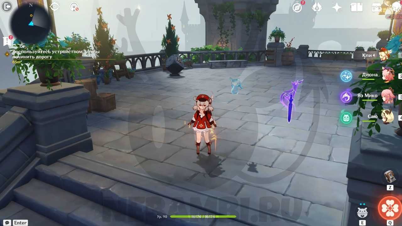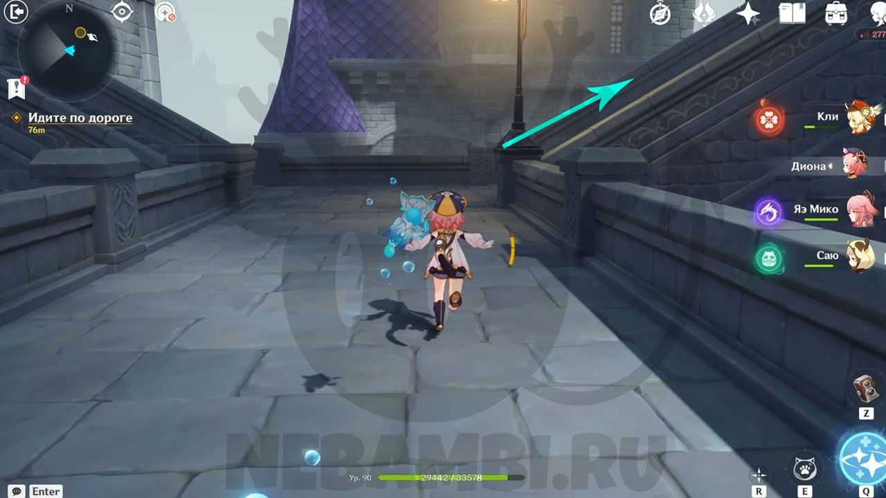 Сначала поднимитесь на лифте справа от врат, поднимитесь по лестнице справа и бегите к хиличурлам.