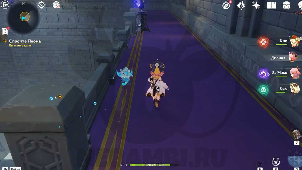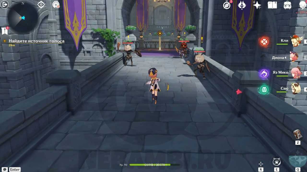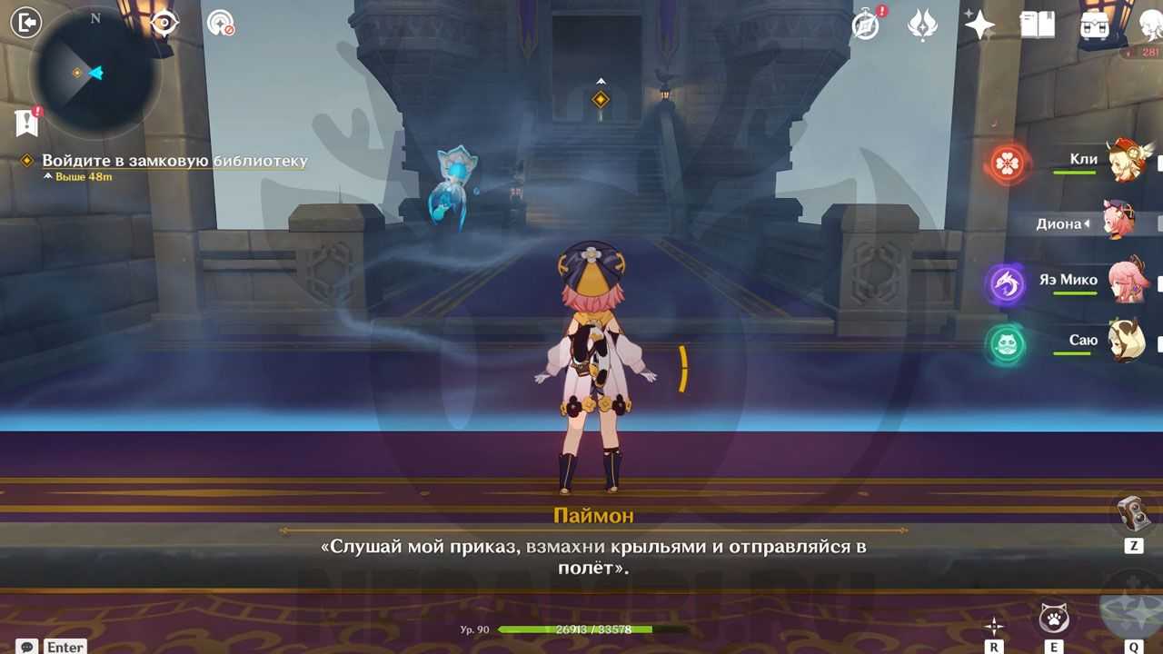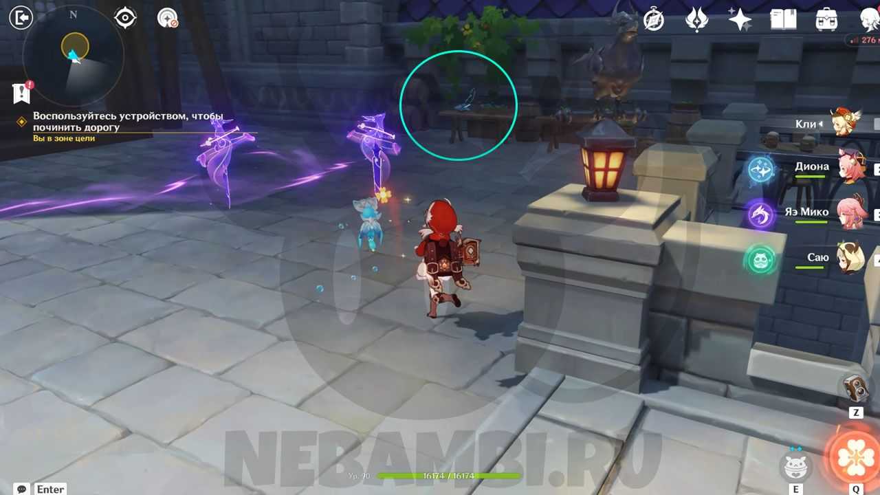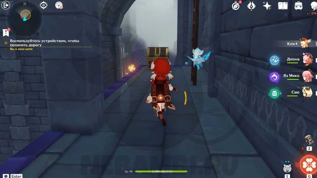Сначала поднимитесь на лифте справа от врат, поднимитесь по лестнице справа и бегите к хиличурлам.