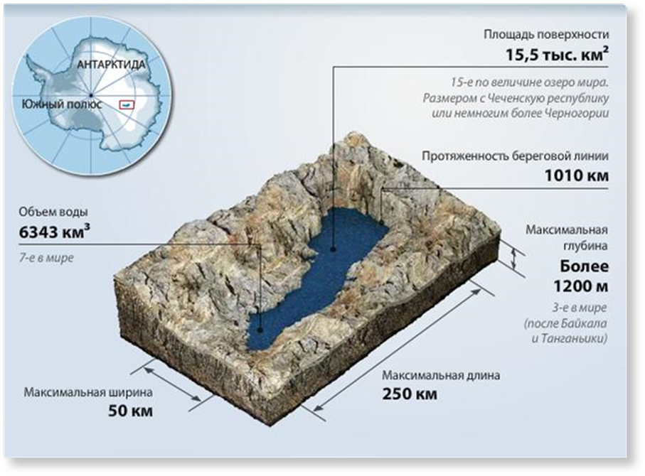 Версия о том, что под многокилометровыми льдами Антарктиды находится уникальное озеро, была высказана еще в середине XX века. А через несколько десятилетий в существовании водоема южнее геомагнитного полюса Земли уже не сомневались. Тогда же были организованы первые попытки бурения льда. В 1972 году полярники не дошли до отметки в 1000 метров, зато в феврале 2013-го уже успешно преодолели почти всю толщу льда, достигнув отметки в 3,7 км. В ходе изысканий было установлено, что подледное озеро – крупнейшее из существующих на Земле водоемов, спрятанных подо льдами. Его длина превышает 157 км, ширина составляет порядка 65 км, а глубина – почти 1,2 км. Озерная вода чрезвычайно обогащена кислородом, количество которого в 50-100 раз больше, чем в пресной воде любого известного поверхностного водоема. Давление там в 400 раз превосходит атмосферное.