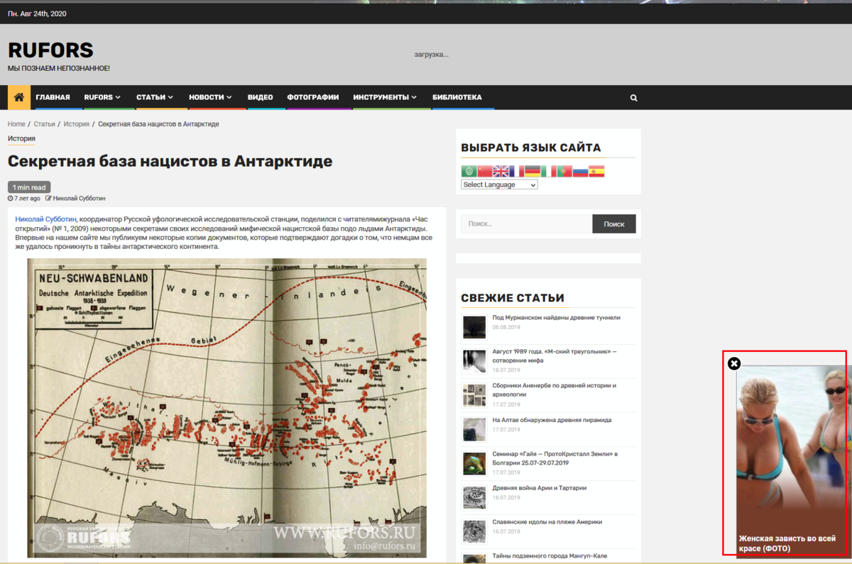 Справа внизу – контекстная реклама на этом “исследовательском” ресурсе с “настоящими” картами прохода немецких подводных лодок в свои подлёдные базы в Антарктиде, которые заходили туда со следующим приказом: