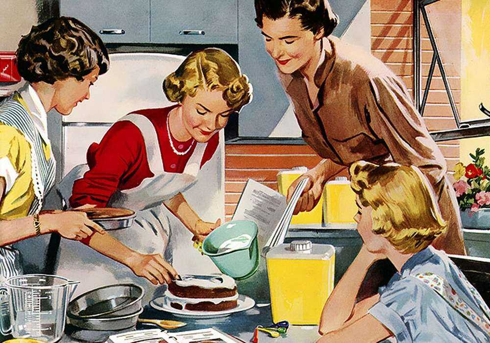 Но домашний быт всегда оставался женской прерогативой, поэтому в 1950-х, в том числе и в СССР, зародился образ идеальной домохозяйки: приветливая стройная женщина, которая печёт пироги в нарядном платье и в макияже, симбиоз труженицы и красотки с большого экрана.