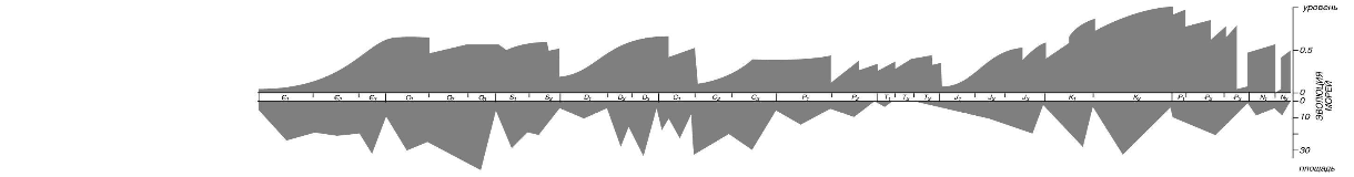 Циклы трансгрессий и регрессий в фанерозое (вверху — уровень моря, внизу — площадь морей)