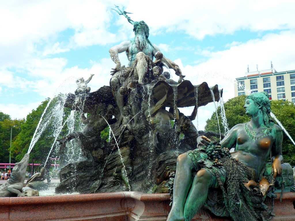 Посейдон наверху фонтана окружён тритонами и различными морскими обитателями. На сторонах чаши расположены женские фигуры с атрибутами – это воплощение немецких рек. Про фонтан ходила интересная история. Якобы императрица Августа Виктория приказала развернуть всю композицию, потому что взгляд Посейдона был направлен прямо на королевскую спальню.