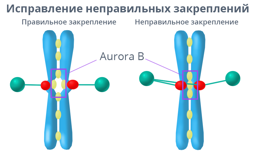 Схема коррекции ошибок закрепления микротрубочек ферментом Aurora B, область действия которого обозначена прямоугольником. Красные кружки – кинетохоры – сложные и до конца не изученные белковые комплексы, расположенные на каждой хромосоме в районе центромеры и служащие для закрепления с микротрубочками веретена деления. Зеленые линии – микротрубочки, зеленые кружочки – центросомы. Светлые овалы – белки когезины, которые скрепляют сестринские хромосомы до момента их разделения