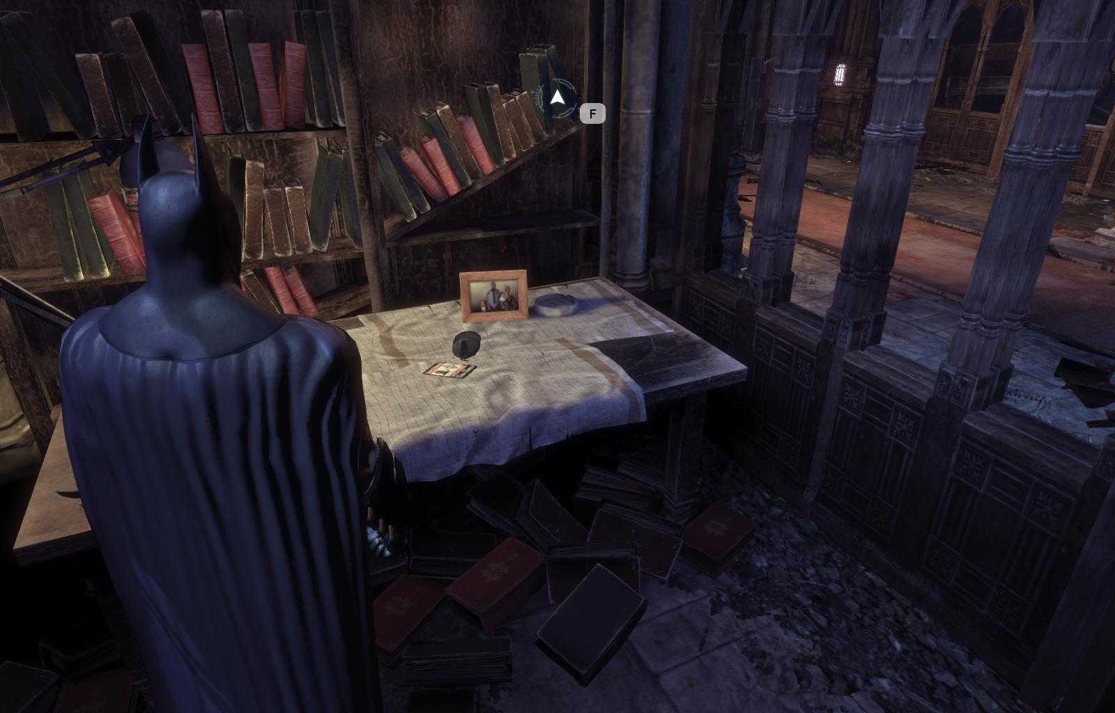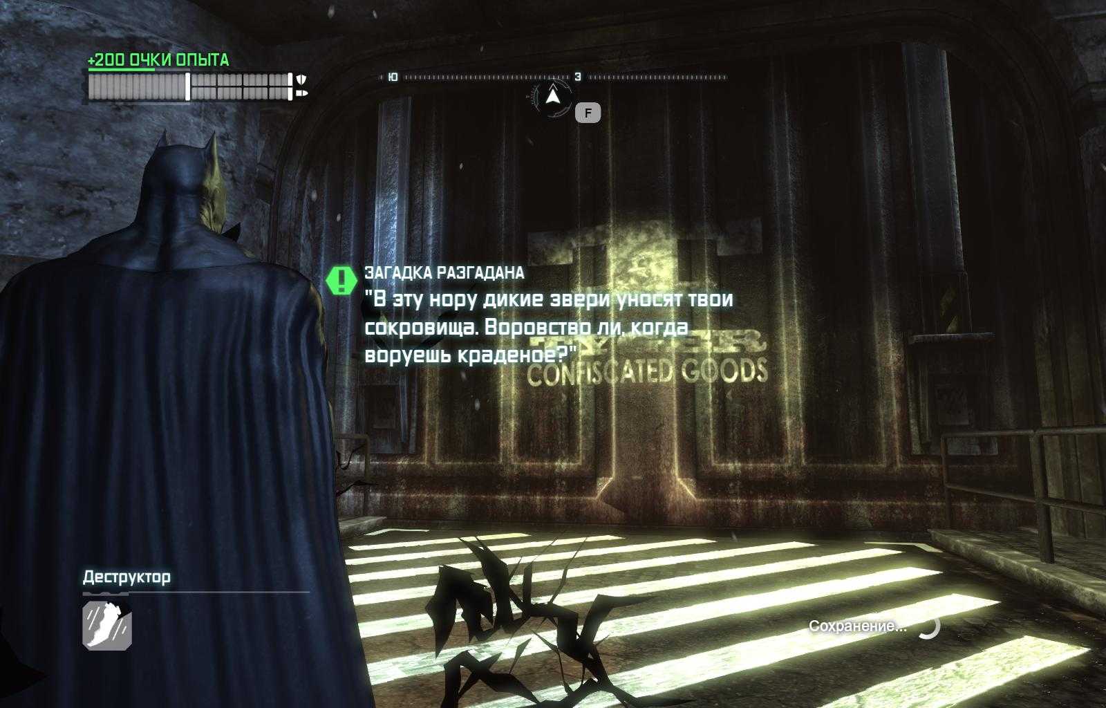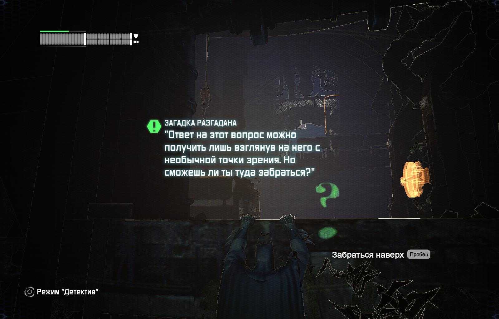 T1.1 – Отключаем оружие деструктором и проходим за загадкой. T1.2 – Управляемым бэтарангом подбираем электрозаряд и перегружаем коробку. T1.3 – Выбиваем знак вопроса бэтарангом. T1.4 – Разбиваем стенку в парении и забираем вопрос. T1.5 – Перегружаем коробку электроразрядником, ломаем стенку и забираем приз. T1.6 – Ломаем фанерку гелем. T1.7 – Скользим под машиной и подбираем. T1.8 – Кидаем льдинку и с неё подбираем загадку.