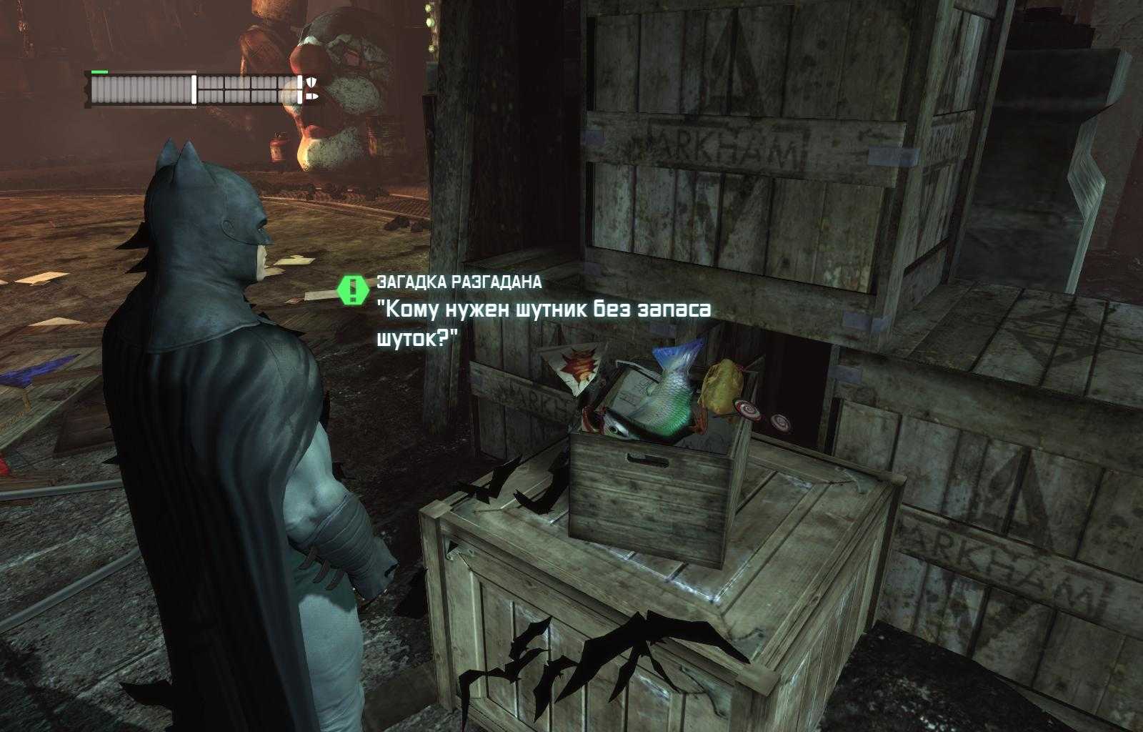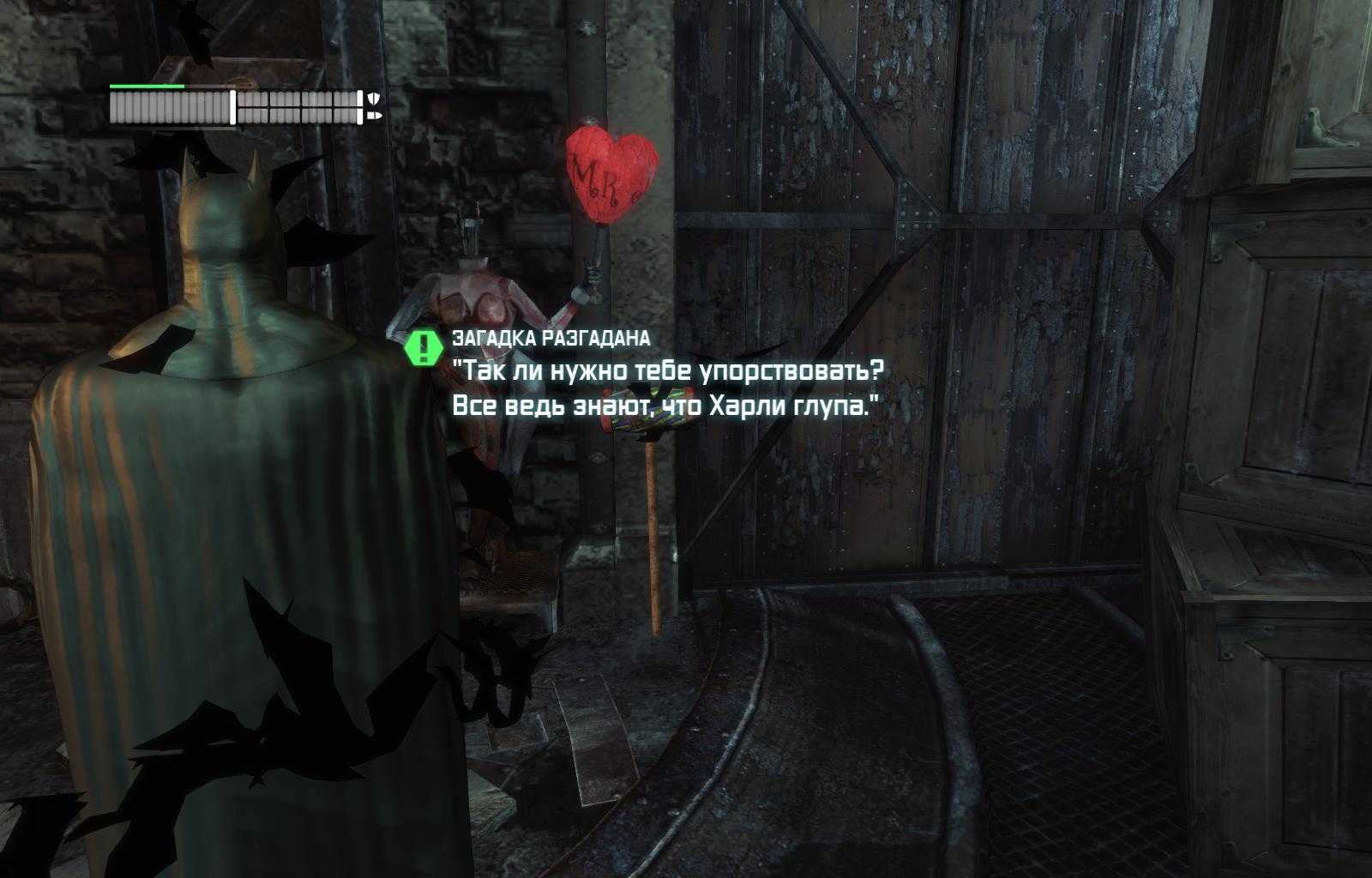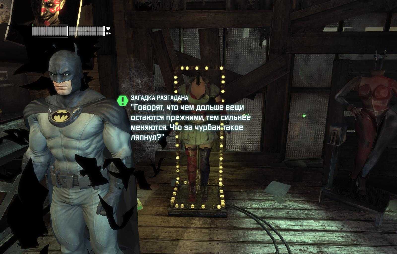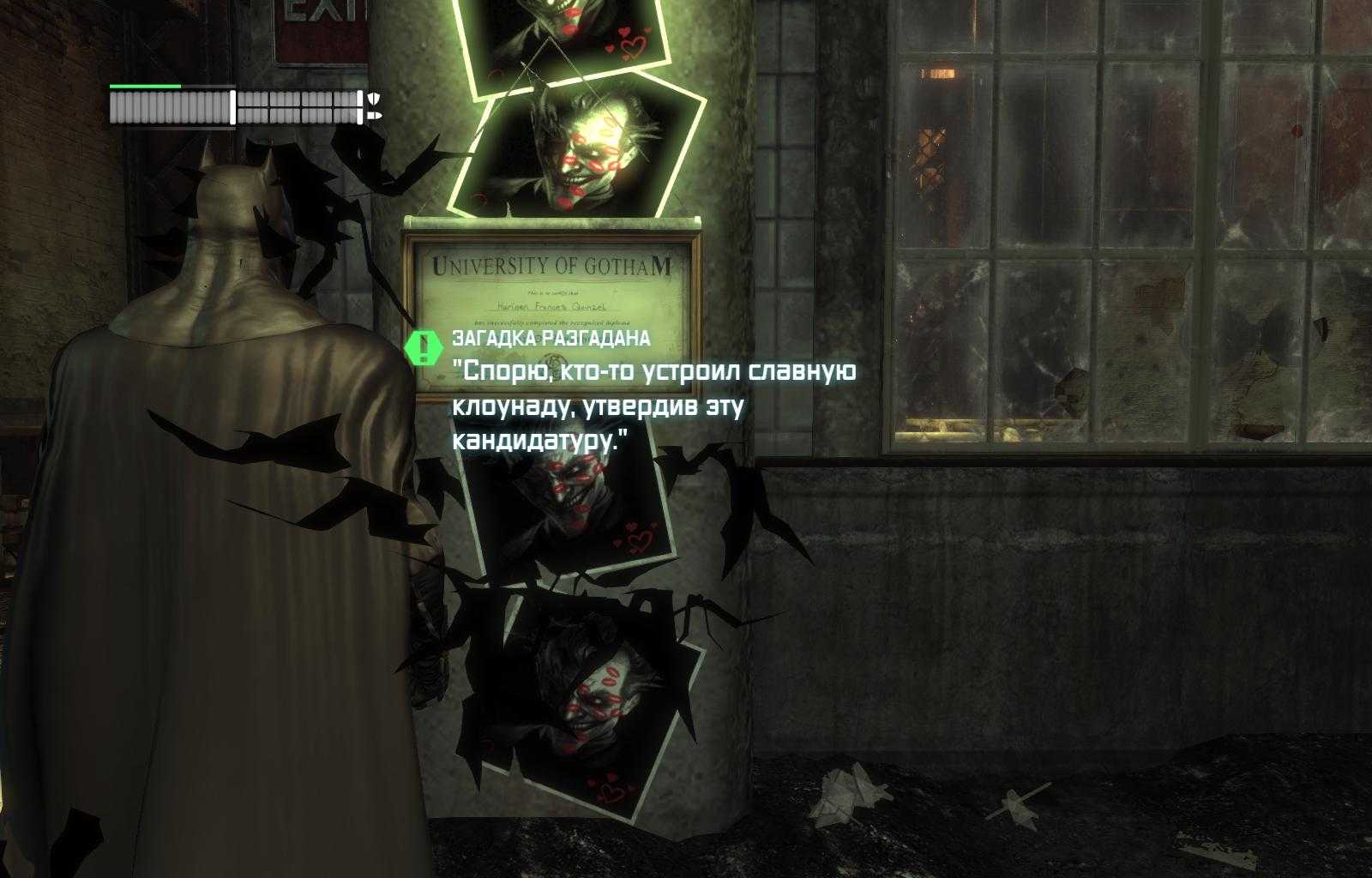 1. Загадка в ДокахКоличество побед в своей борьбе он отмечает прямо на себе.2. Загадка на западном небоскребеВ богатеньком доме живёт наш мажор, родители умерли, он пирует с тех пор.3. Загадка в ПодземкеНеправда, будто врут календари! Не веришь? На него ты посмотри!4. Загадка на базе боевиковЗа ним угнаться можно еле-еле – он умирает каждую неделю.5. Загадка в церквиЗдесь лежит святой покровитель тех, кто мечтал покорить своей властью всех.6. Загадка в Pretty Dolls ParlorСтранный цирк зажигает свои огни, в нём у клоуна рыло, как у свиньи.7. Загадка в Goth CorpЕго жизнь навсегда изменил мороз, и жену погрузил он в анабиоз.8. Загадка с ПингвиномЗдесь ремонта, видимо, не было никогда – ну а в прочем, чего от пингвиньего ждать гнезда?9. Загадка на ВерфиНелегко предводителю культа принять, что пришлось ему многое потерять.10. Загадка БэтмобильТёмный рыцарь — и оруженосец тёмный, его верный слуга и помощник скромный.
