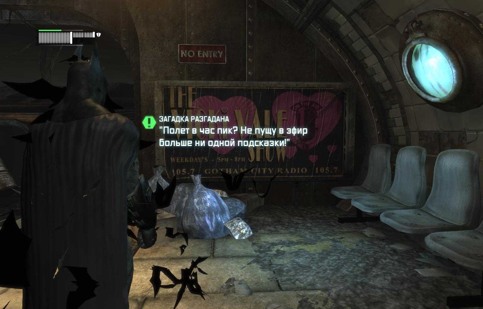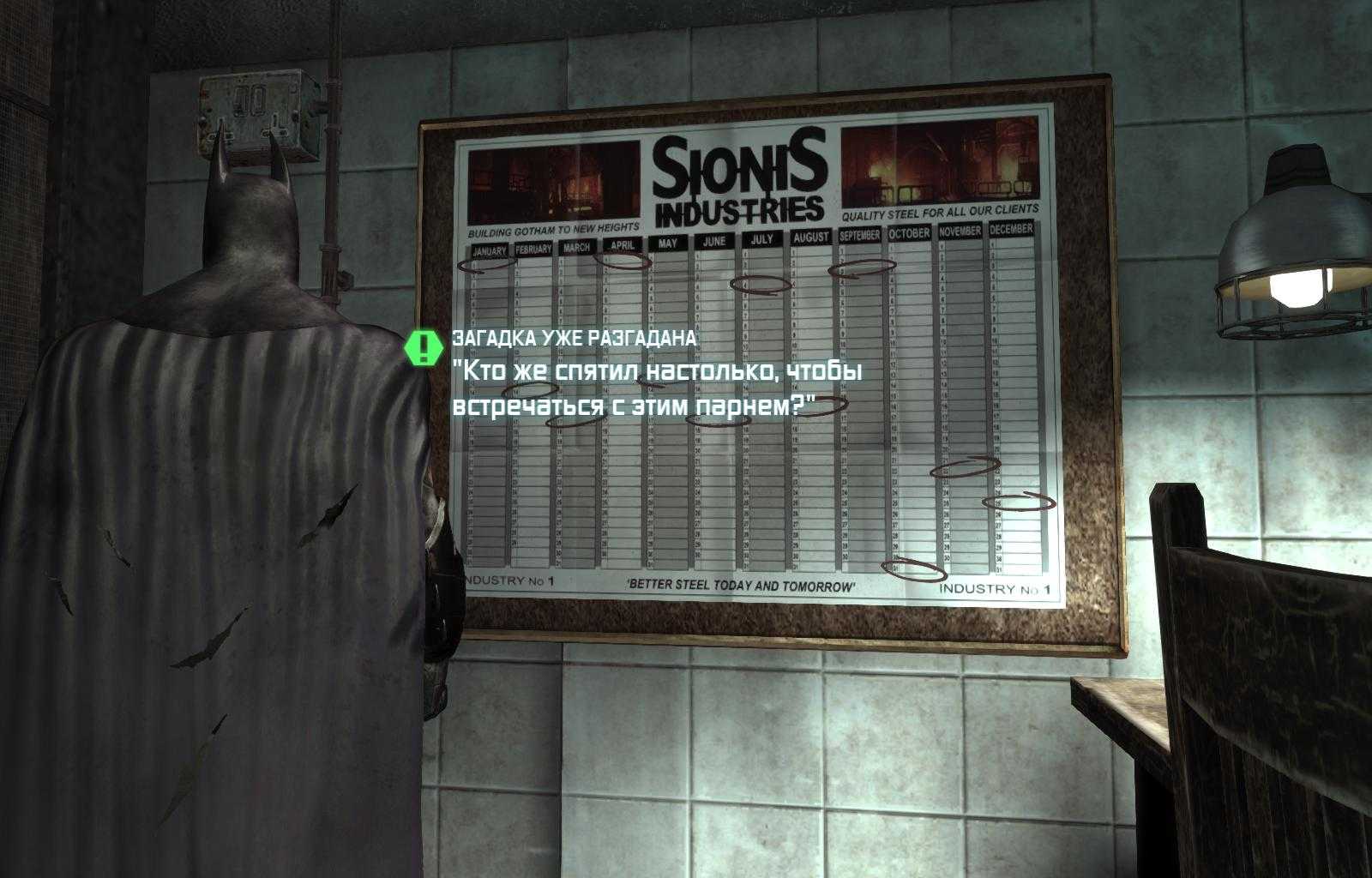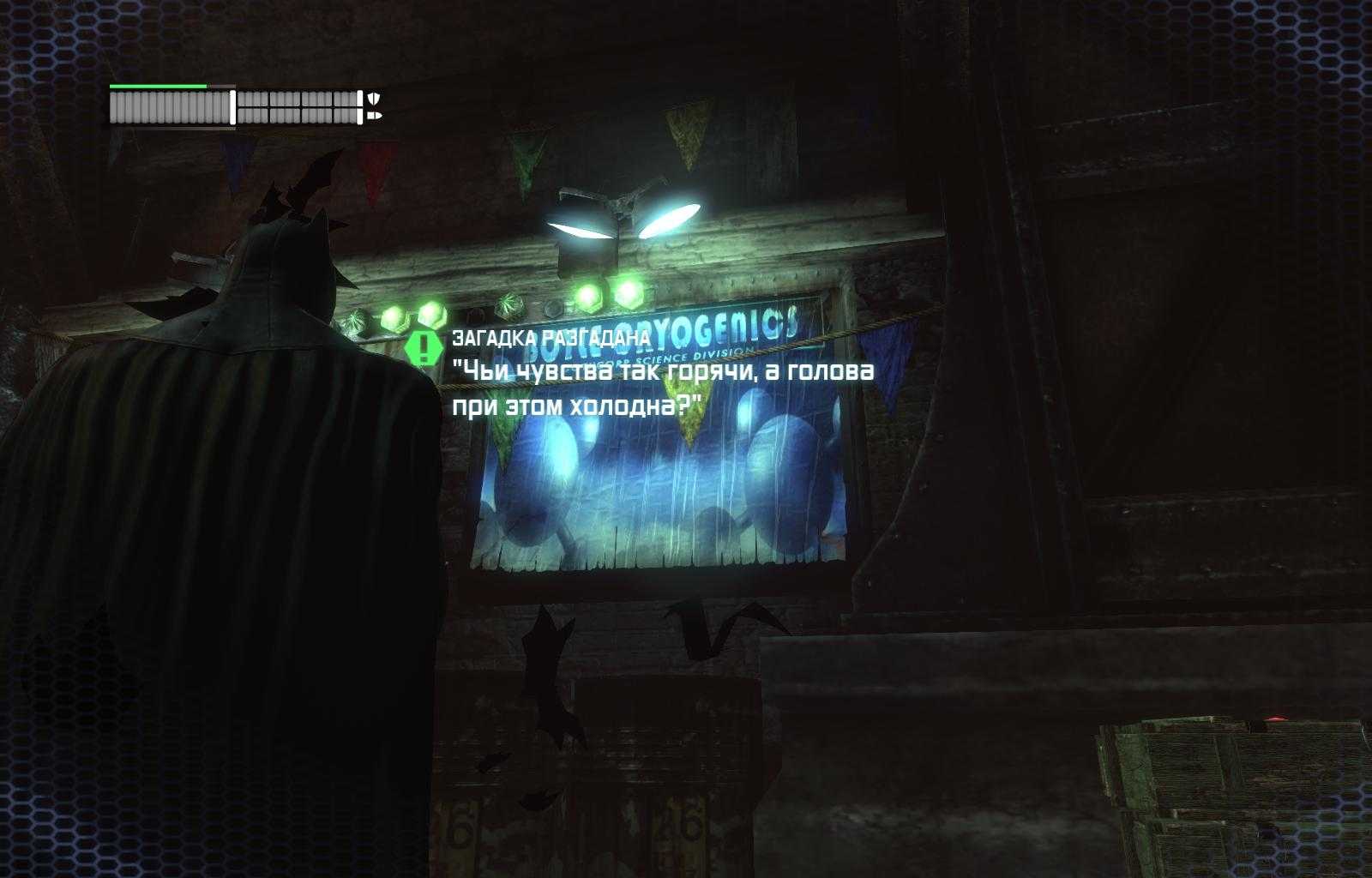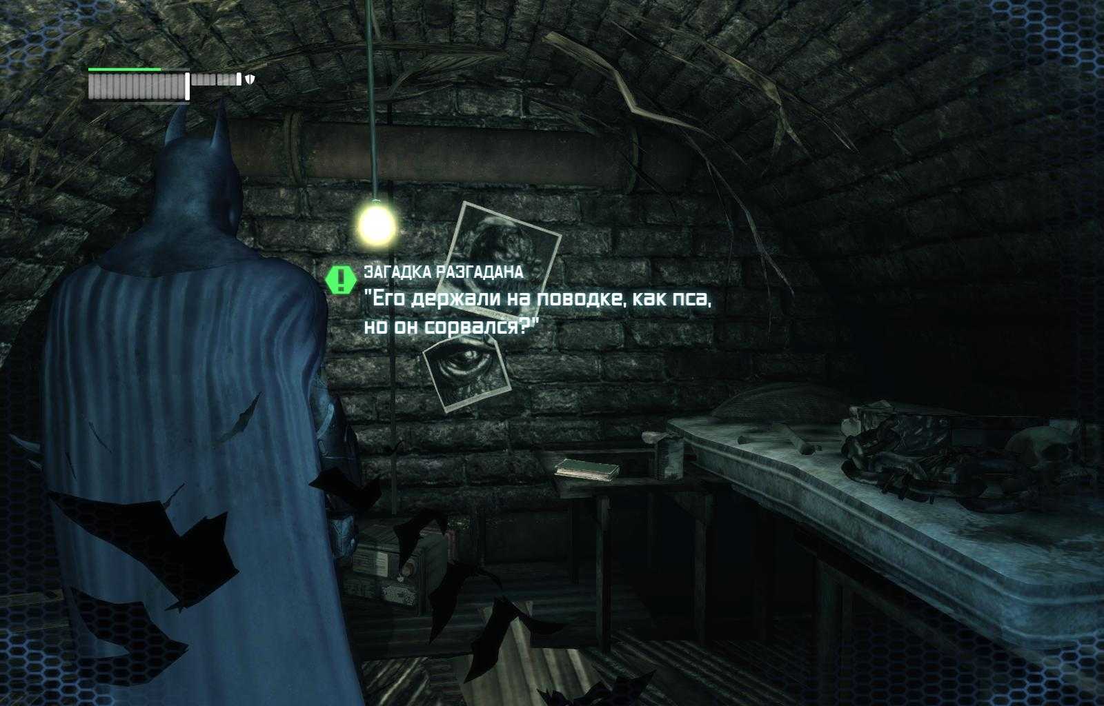 1. Загадка в ДокахКоличество побед в своей борьбе он отмечает прямо на себе.2. Загадка на западном небоскребеВ богатеньком доме живёт наш мажор, родители умерли, он пирует с тех пор.3. Загадка в ПодземкеНеправда, будто врут календари! Не веришь? На него ты посмотри!4. Загадка на базе боевиковЗа ним угнаться можно еле-еле – он умирает каждую неделю.5. Загадка в церквиЗдесь лежит святой покровитель тех, кто мечтал покорить своей властью всех.6. Загадка в Pretty Dolls ParlorСтранный цирк зажигает свои огни, в нём у клоуна рыло, как у свиньи.7. Загадка в Goth CorpЕго жизнь навсегда изменил мороз, и жену погрузил он в анабиоз.8. Загадка с ПингвиномЗдесь ремонта, видимо, не было никогда – ну а в прочем, чего от пингвиньего ждать гнезда?9. Загадка на ВерфиНелегко предводителю культа принять, что пришлось ему многое потерять.10. Загадка БэтмобильТёмный рыцарь — и оруженосец тёмный, его верный слуга и помощник скромный.