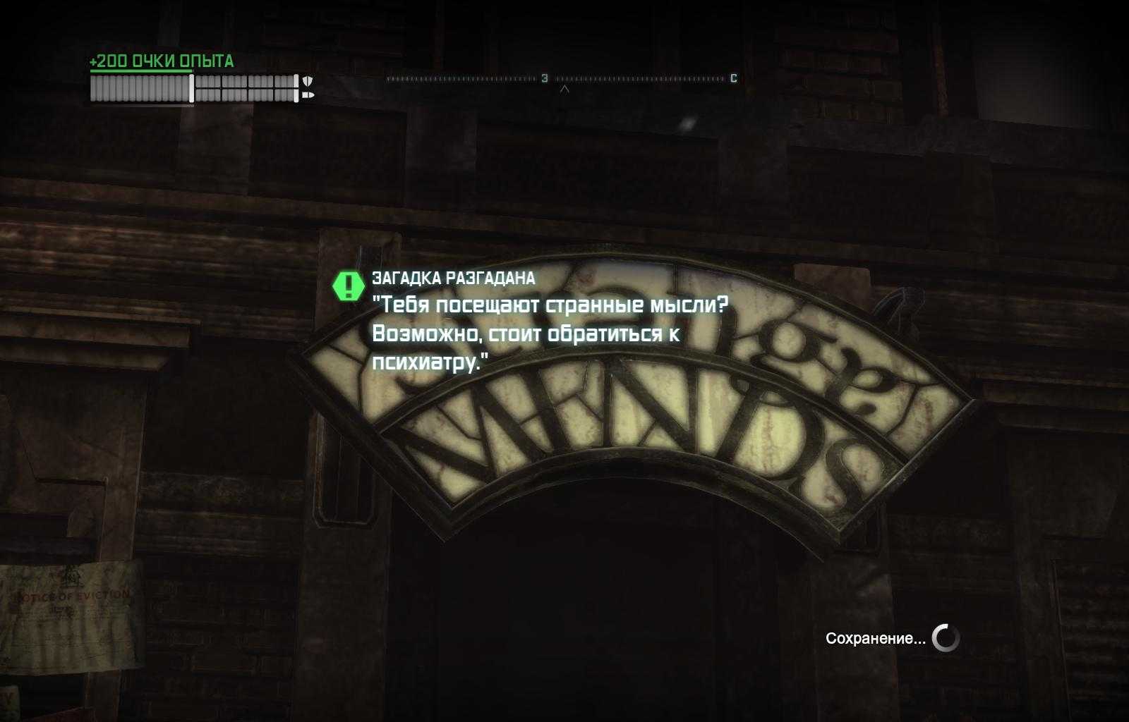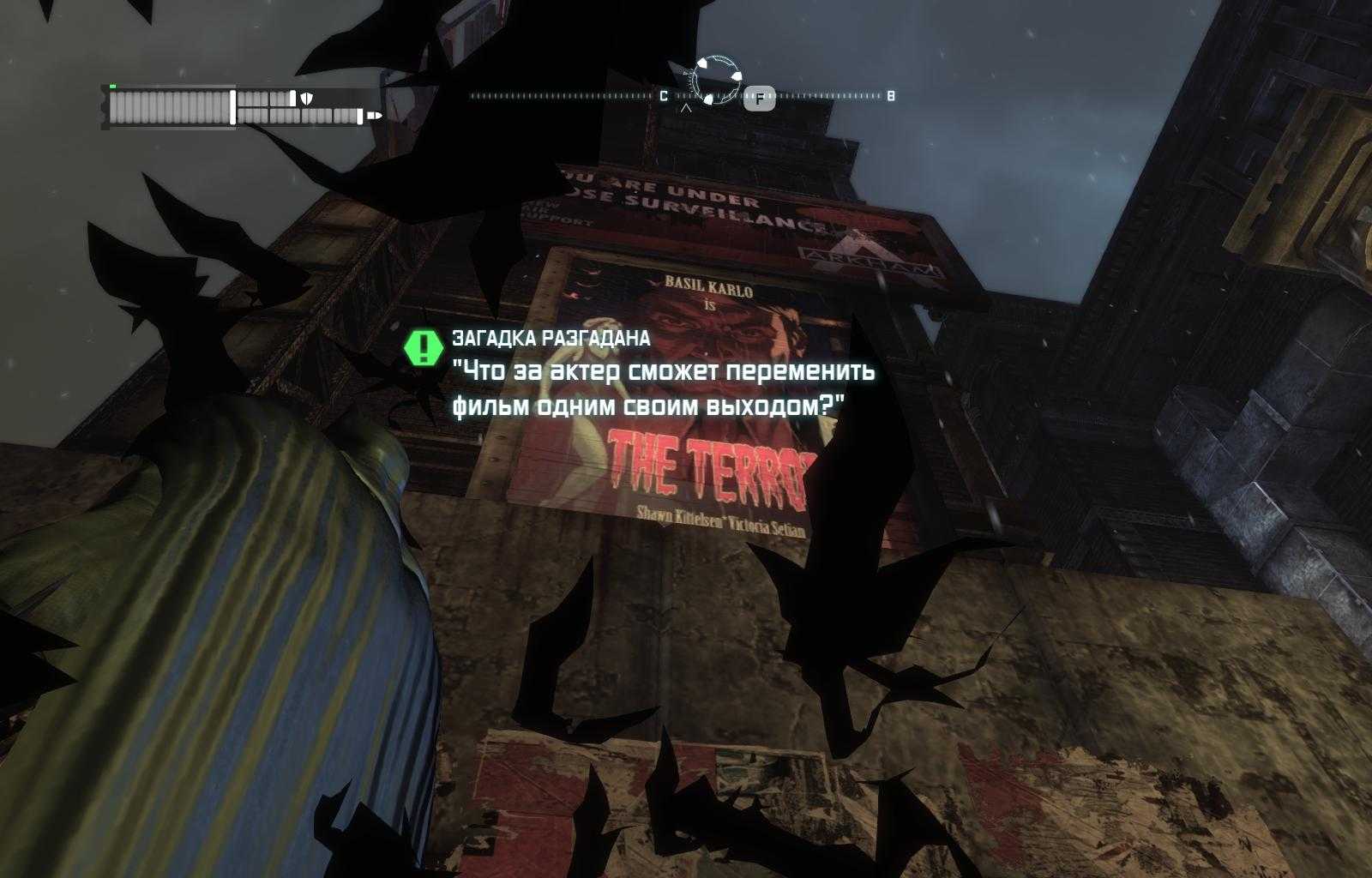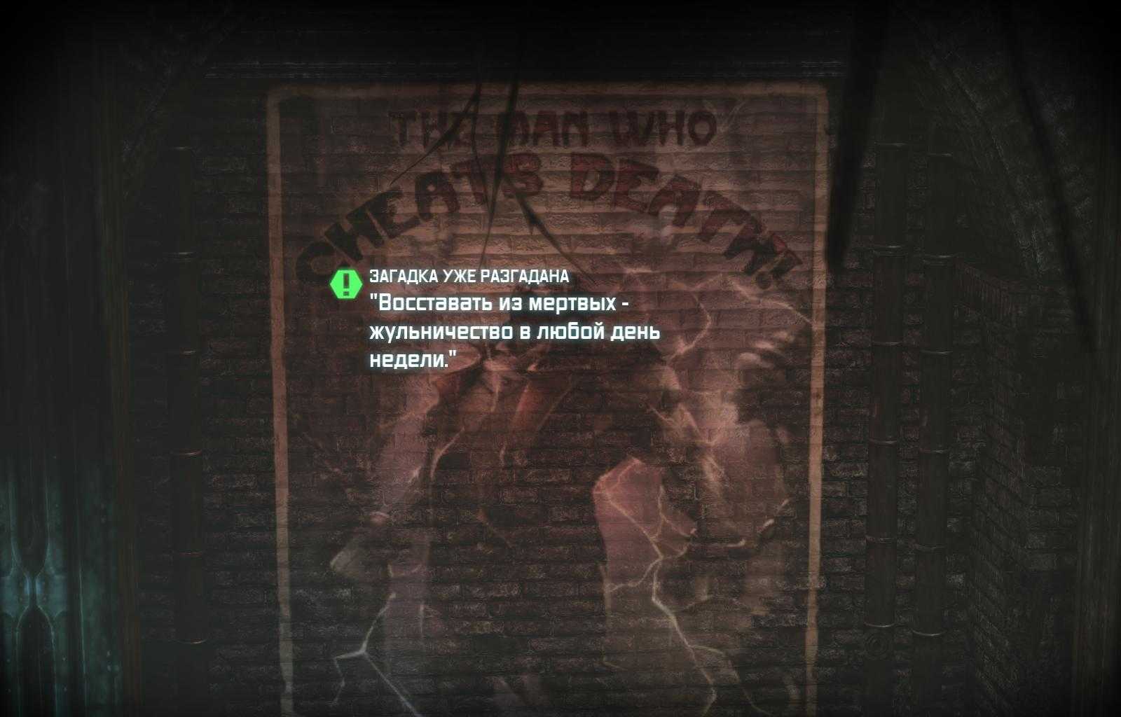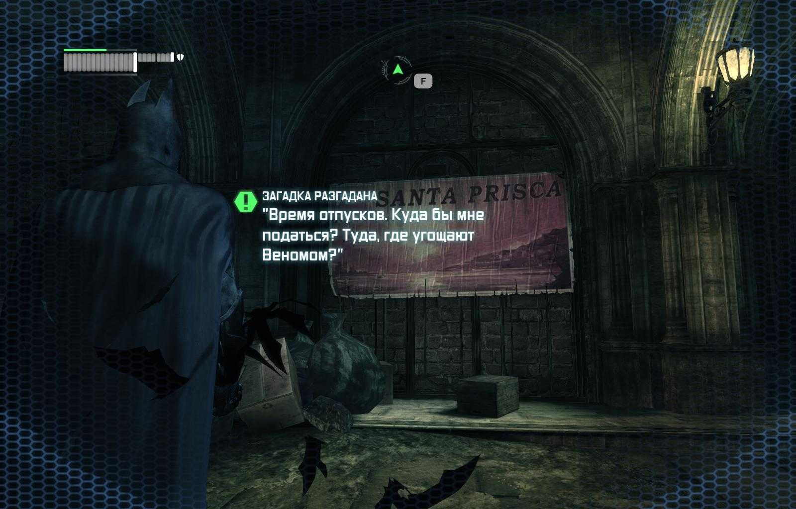 1. Загадка в ДокахКоличество побед в своей борьбе он отмечает прямо на себе.2. Загадка на западном небоскребеВ богатеньком доме живёт наш мажор, родители умерли, он пирует с тех пор.3. Загадка в ПодземкеНеправда, будто врут календари! Не веришь? На него ты посмотри!4. Загадка на базе боевиковЗа ним угнаться можно еле-еле – он умирает каждую неделю.5. Загадка в церквиЗдесь лежит святой покровитель тех, кто мечтал покорить своей властью всех.6. Загадка в Pretty Dolls ParlorСтранный цирк зажигает свои огни, в нём у клоуна рыло, как у свиньи.7. Загадка в Goth CorpЕго жизнь навсегда изменил мороз, и жену погрузил он в анабиоз.8. Загадка с ПингвиномЗдесь ремонта, видимо, не было никогда – ну а в прочем, чего от пингвиньего ждать гнезда?9. Загадка на ВерфиНелегко предводителю культа принять, что пришлось ему многое потерять.10. Загадка БэтмобильТёмный рыцарь — и оруженосец тёмный, его верный слуга и помощник скромный.