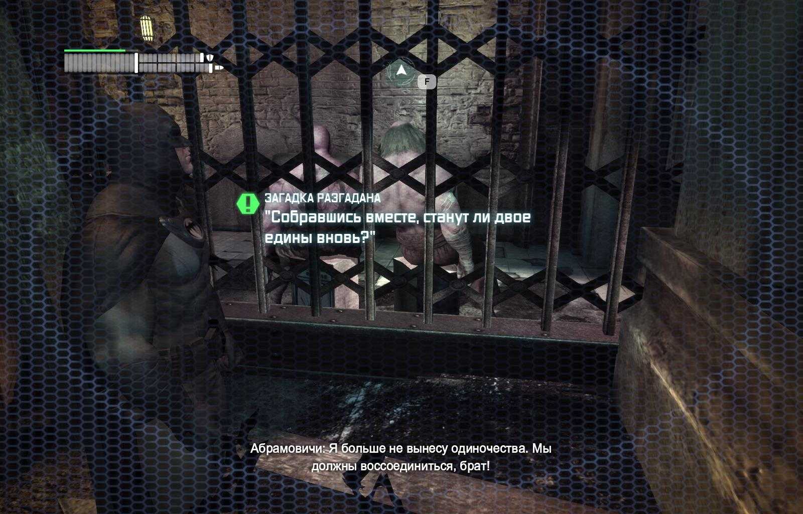 T4.3 – В режиме детектива определяем активный вопрос и гасим его бэтарангом. T4.4 – Забираем вопросик из кельи. T4.5 – Нажимаем на плиту и снимаем Бэткогтем. T4.6 – Взрываем обе мины ДеструктороМ. T4.7 – Пикируем вниз, пока не захлопнулся люк.