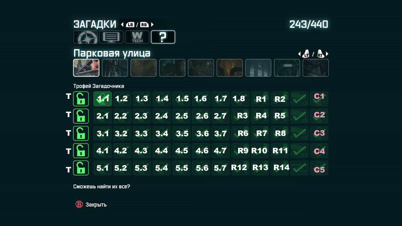 T1.1 – Открываем люк и забираем загадку. T1.2 – Открываем люк и забираем загадку. T1.3 – За хрупкой стенкой. T1.4 – Просто подбираем. T1.5 – Открываем ловушку шифровальным секвенсором и забираем Бэткогтем.