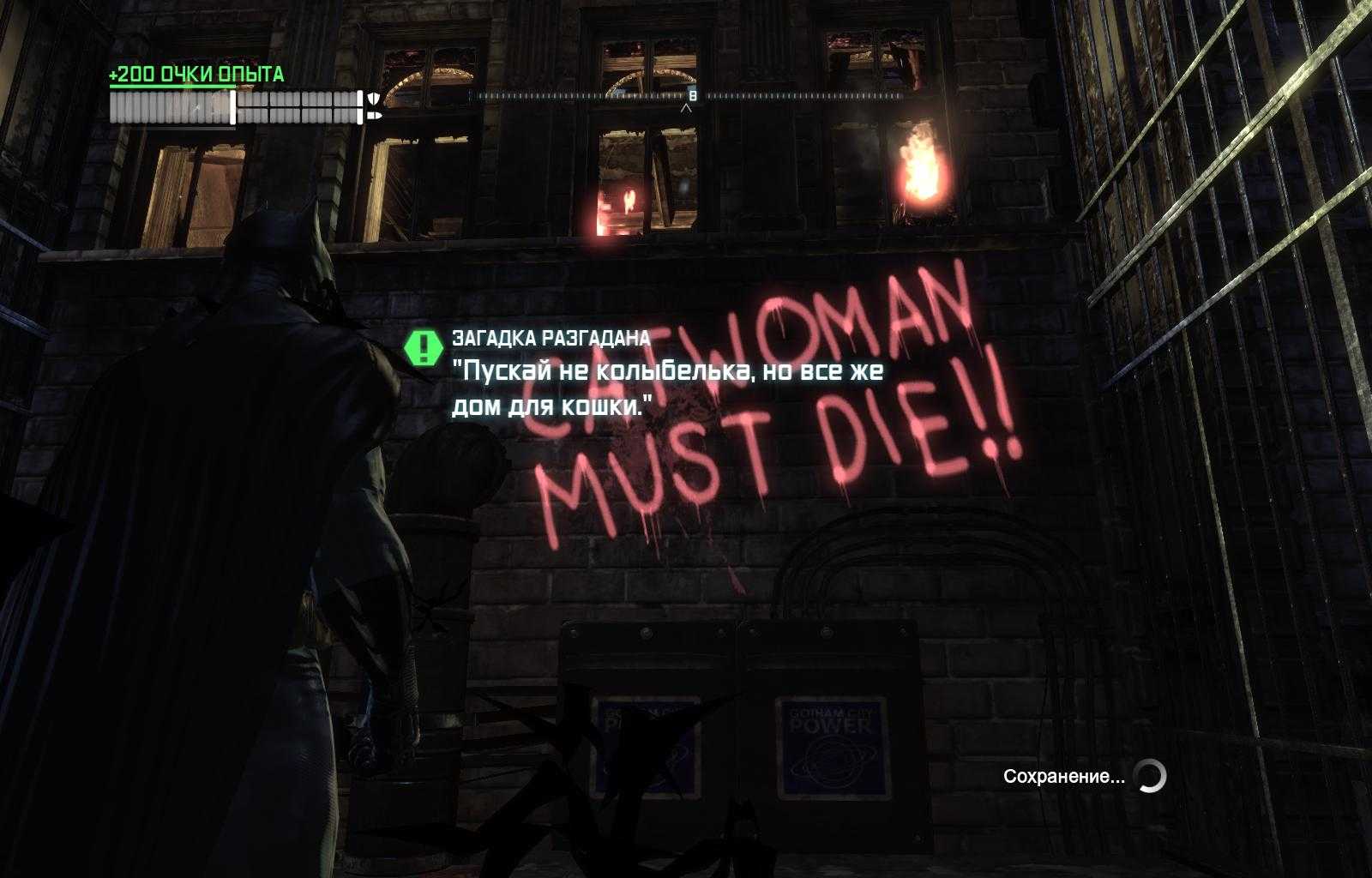 Сражаемся с мелкими роботами, уничтожаем всех синих врагов. После этого появится Женщина-кошка, ей сможем добить красных врагов. Когда роботов не останется, включаем парный добивающий удар, от этого отключится защита у Загадочника. Подходим и ударяем его.