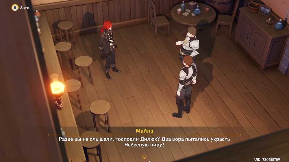 Внутри мы знакомимся с хозяином трактира — мастер Дилюк. Ранее мы его уже видели во время задания с Кэйа в Храме Волка. Но его обмануть не так просто, он явно догадался, что бард от кого-то скрывается и попросил бармена присмотреть за этой кампанией.