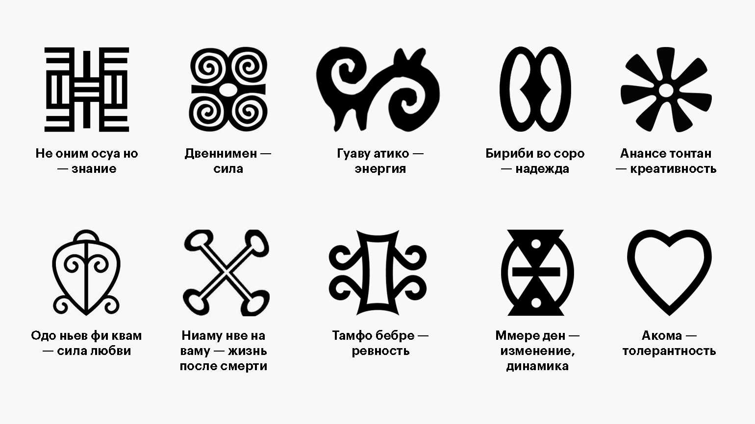 Племена Ганы и Кот-д’Ивуара в адинкре используют различные символы со специальными значениями. Они ассоциируются с фразеологизмами и ценностями культуры Ашанти.