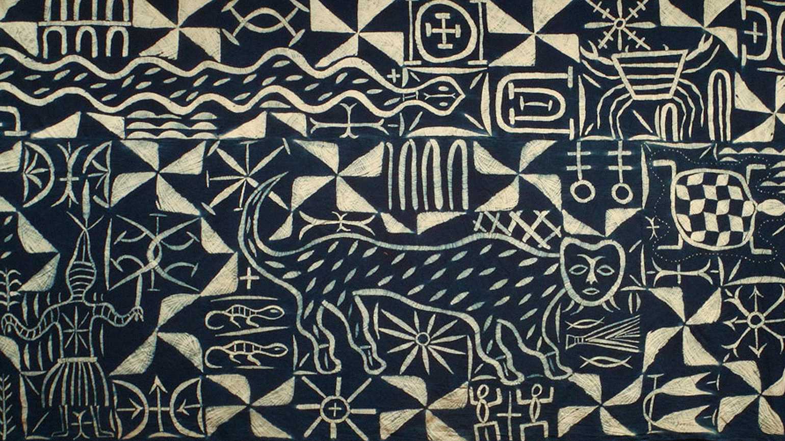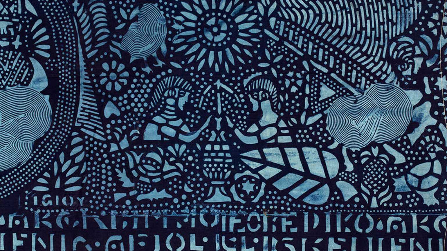 Адире с изображением короля и королевы на ткани, сотканной с использованием крахмала кассавы. Изображение: Victoria and Albert Museum / London